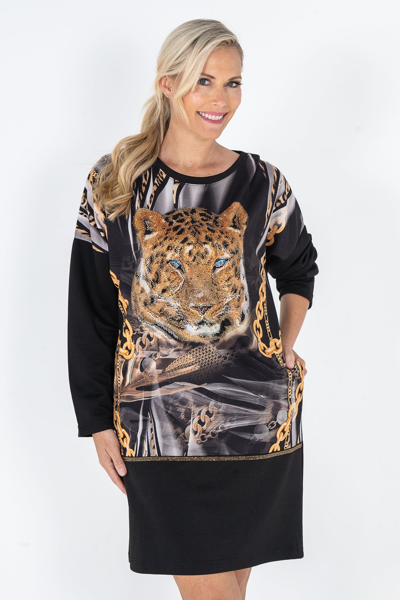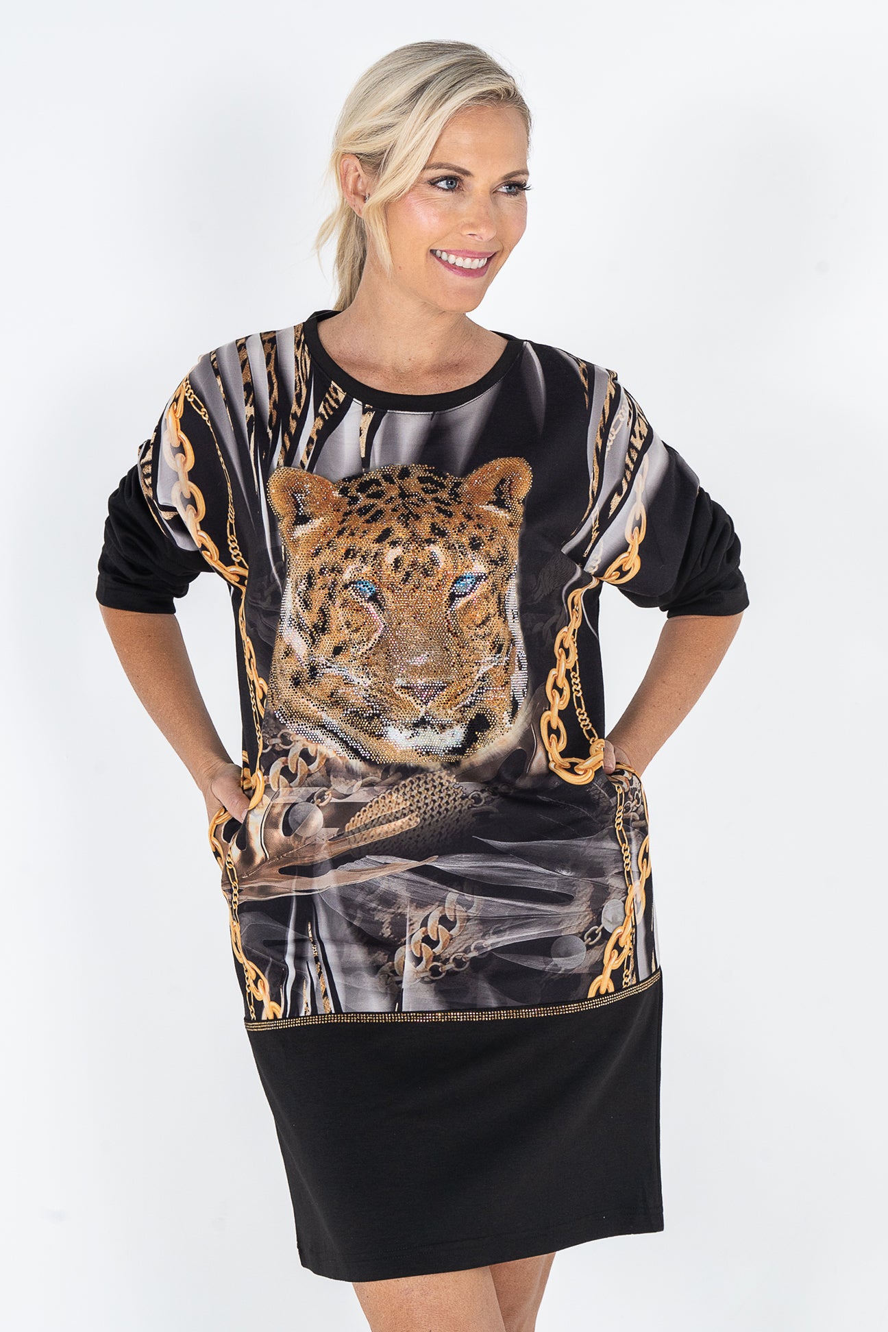 We love leopards! Wear with leggings or without. Full length sleeve. Crystal Embellishments.